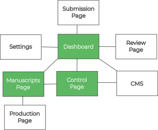 Kotahi has a number of screens or pages connected together that allow for the amazing versatility of workflows. From a very high level, the interconnected ‘spaces’ or pages look like the following.